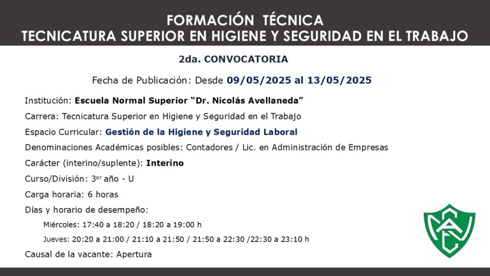 A su vez, los interesados en conocer la LOM correspondiente a las horas vacantes de Proyecto Integrador de la TS en Higiene y Seguridad en el Trabajo de la Escuela Normal Superior «Dr. Nicolás Avellaneda», deberán seleccionar acá.
